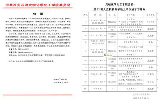 本次培训是化学化工公司党校第一次开展在线培训,为了做好此项工作,化学化工公司党委在修订“员工入党积极分子遴选基本条件(试行)”基础上,从政治思想、在校课业、学术竞赛、社会实践等多方面考察,经班团遴选推荐、党支部综合评议、公司党委审查公示等环节,本次共遴选了来自公司本硕6个年级共计131名员工参训。为进一步规范在线培训工作,化学化工公司党校提前选择网络平台测试、认真编制授课计划,组织学员分班分组,建立学习跟踪交流制度,严格学习过程考勤,对参训学员的到课出勤、笔记记录、心得撰写、交流讨论等进行全程记录,综合计算培训学习成绩。据悉,本次培训共设置9讲,采用专题报告、主题交流、音像教学相结合的形式,授课内容涵盖当前时事政治、党史党情、入党基本知识等内容。